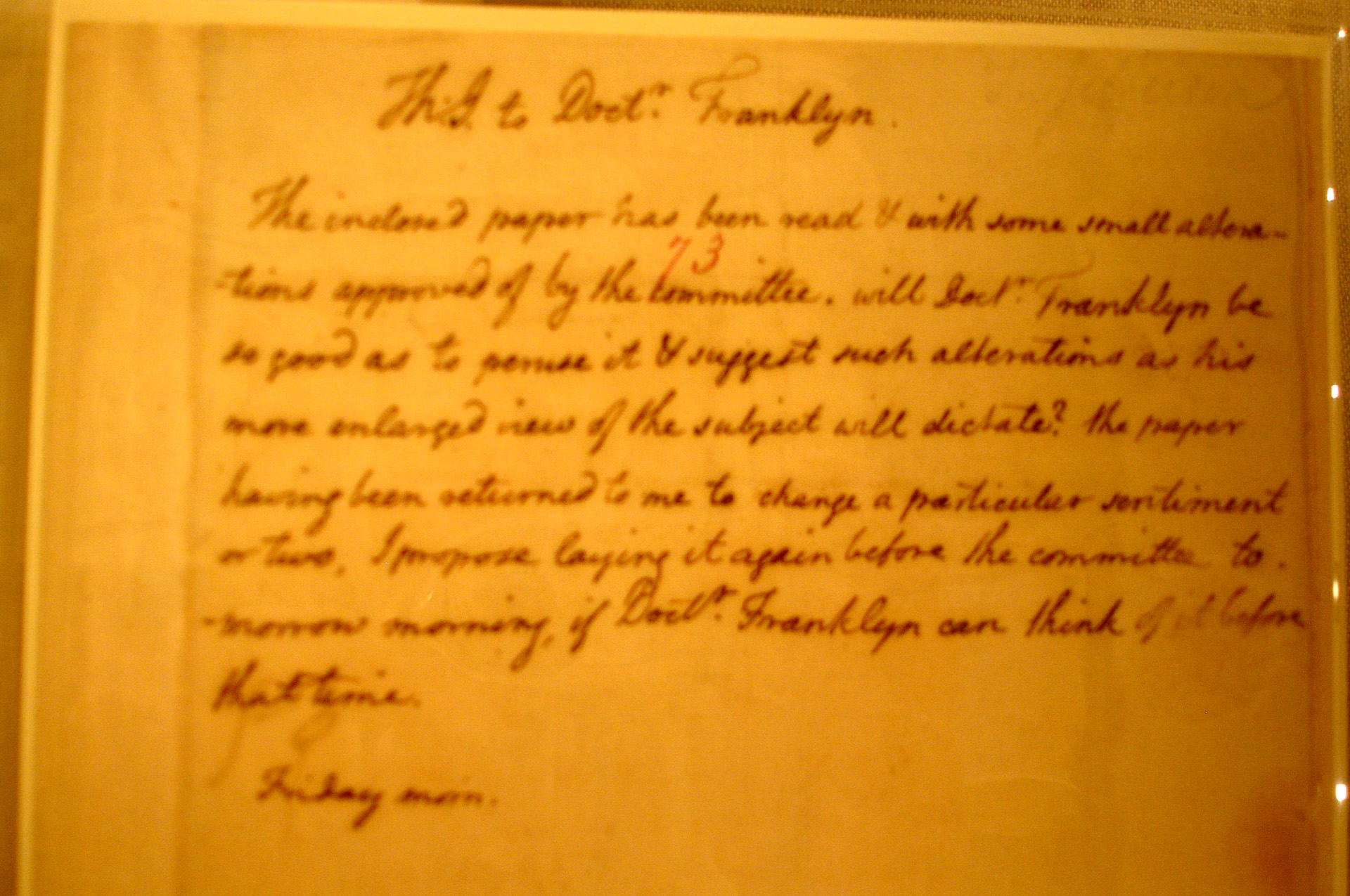 Accompaning the original Declaration was this letter, again in Jefferson's handwriting, to Benjamin Franklin, asking his opinion of the Declaration.